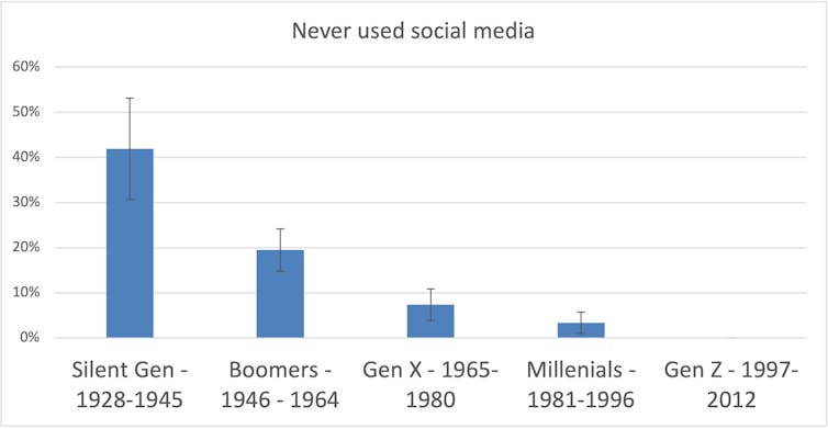 Of the Silent Generation (currently 76-93 years old), 40% had never used social media. This dropped to 0% among Gen Z (9-24 years old).