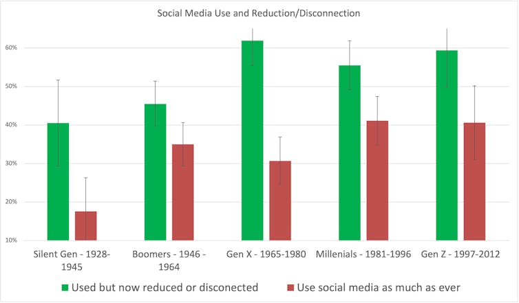 But the rates of reduction and disconnection among millennials (25-40 years old) decreased, before increasing again for Gen Z. Millennials were also much more likely than Gen X to have never reduced their social media use at any point.