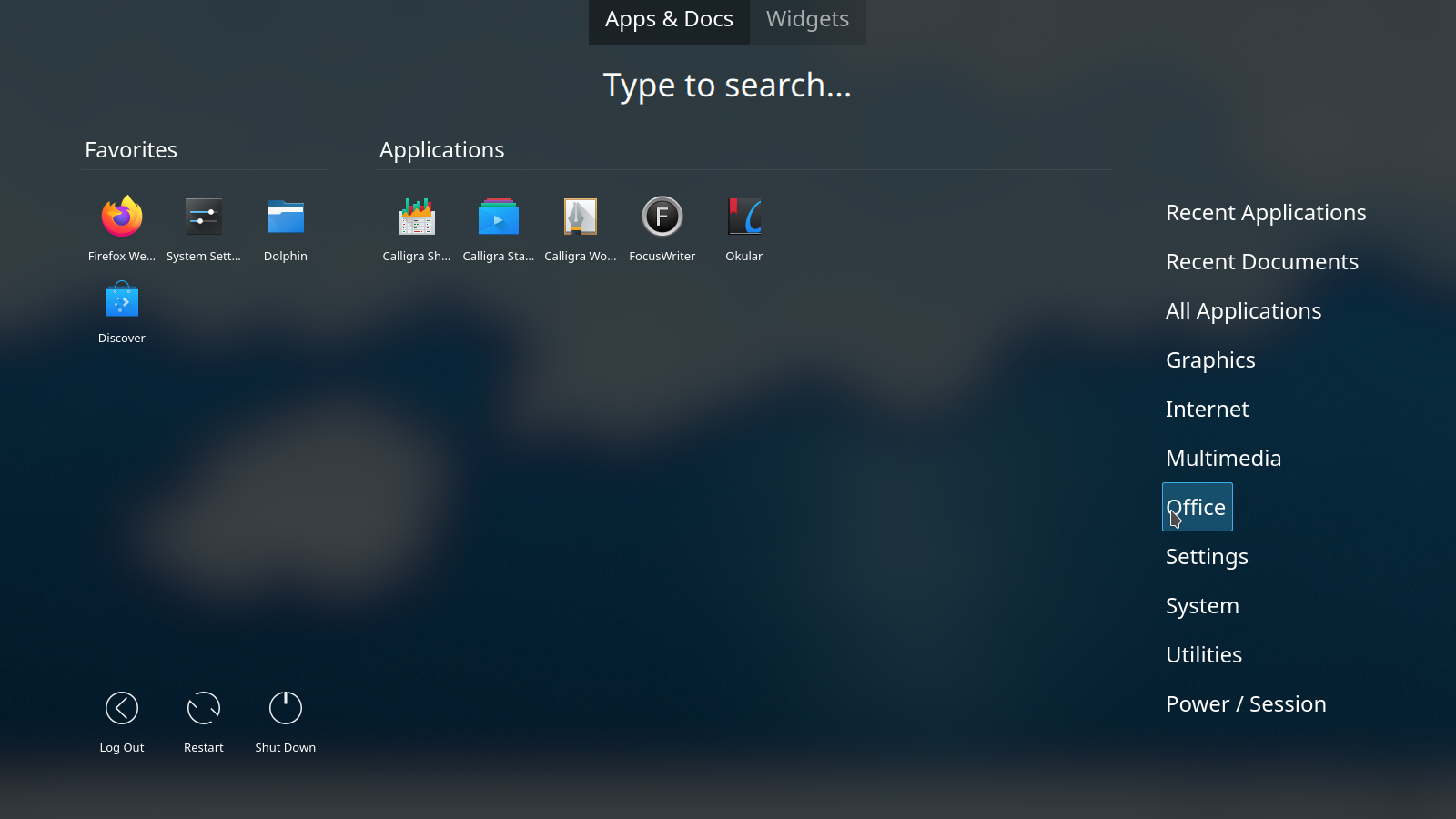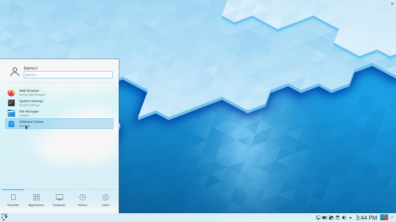 As a small example, the user can set up one of three different “start menus” – the default is the standard KDE setup as shown above. A more traditional “fly out” style can be invoked if the user wants a simplified start menu. Another alternative is an “application dashboard” which can be selected if the user prefers a more graphical menu – this arrangement is shown in the screen shot below.